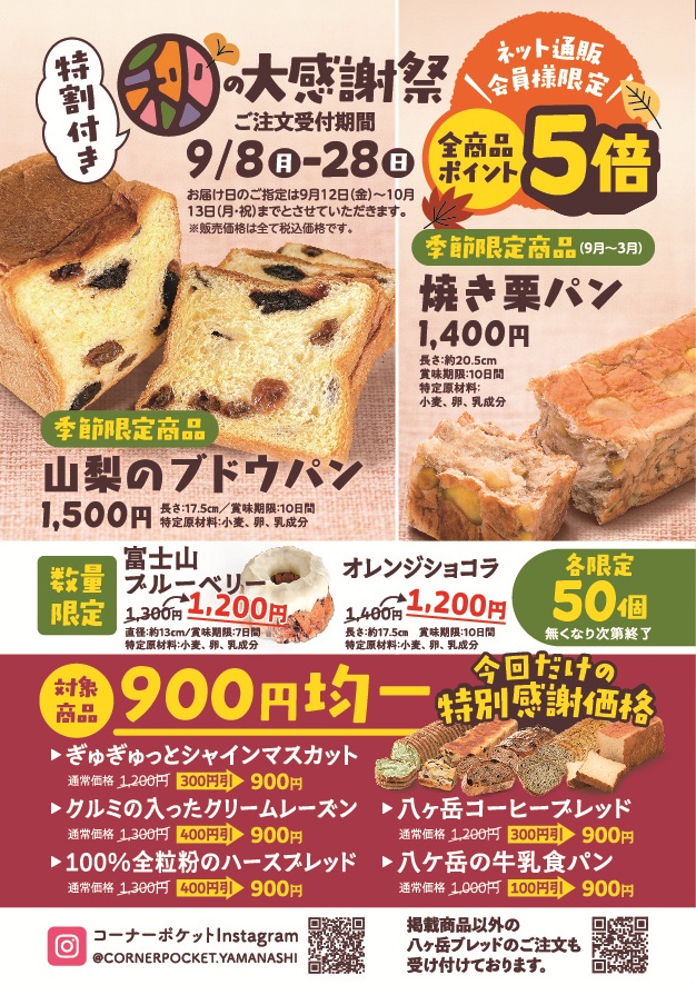 毎年大人気、『山梨のブドウパン』『焼き栗パン』を販売します♪秋の味覚を皆さんぜひ味わってみてください!そして・・・今回のお取り寄せキャンペーンは今までにない特別感謝価格にて八ヶ岳ブレッドを販売!!また、数量限定で過去のお取り寄せキャンペーンで販売していた商品も登場♪今年の秋はお得な商品が盛りだくさんなのでこの機会をお見逃しなく👀