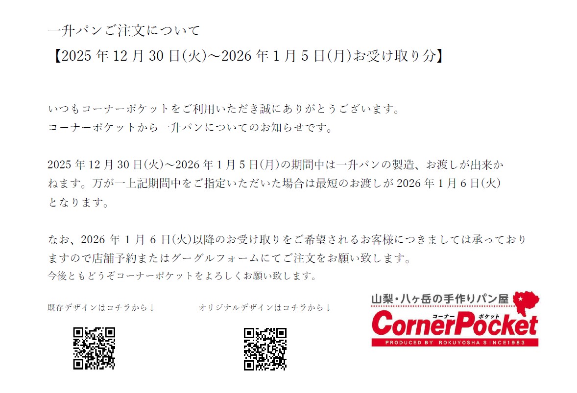 2025.12.16ブログ 年末年始 一升パンご注文について Post Share LINE note ブログ, 新着情報 定休日新設についてのお知らせ【12.5(金)更新】 2026年1月オンラインショップ限定キャンペーン 関連記事一覧 【5/8更新】2020年5月催事スケジュール ゴールデンウィークの営業日のお知らせ 秋の感謝祭2024 くらし応援キャンペーン 2024年11月催事スケジュール ベトナムハノイの日本のパン